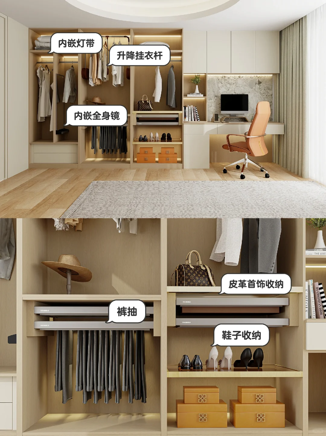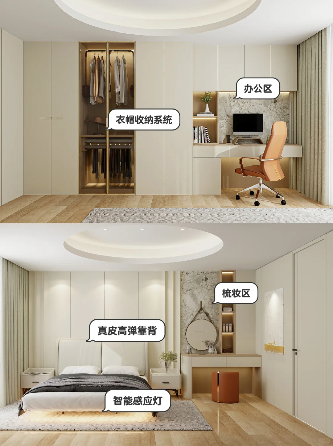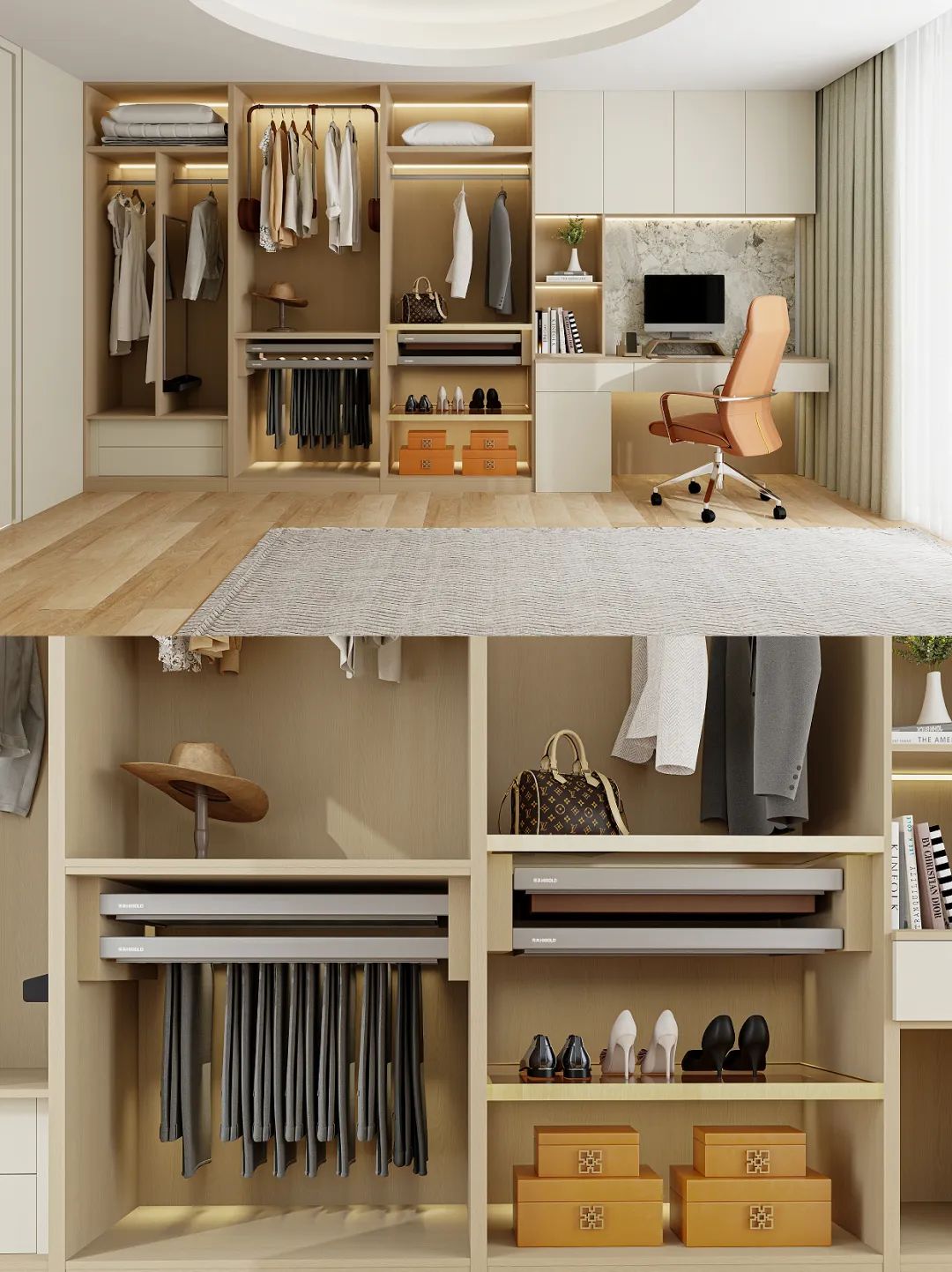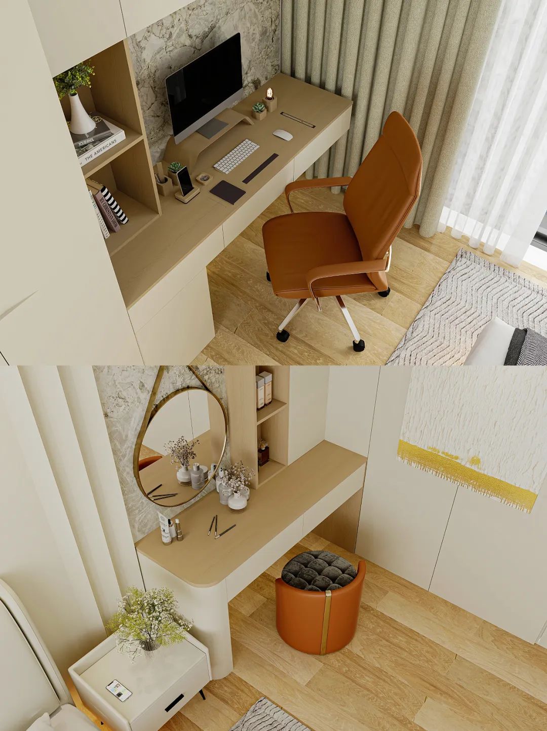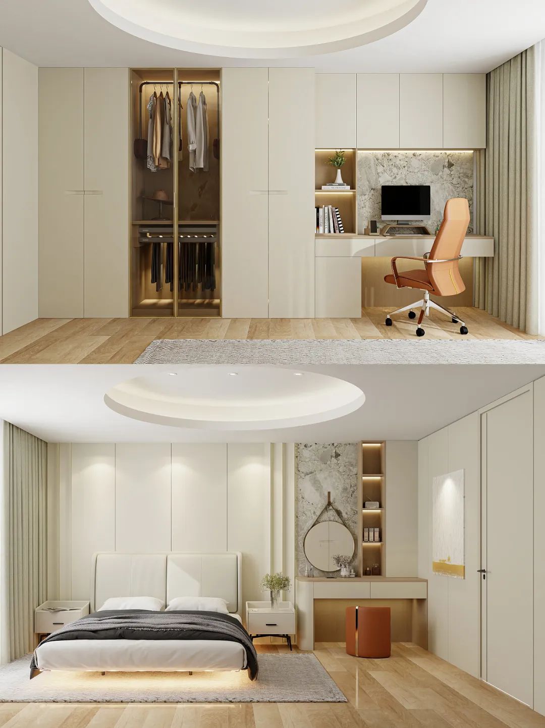 ▫️书桌柜与衣柜一体化设想,视觉结果更全体流利,节流空间的同时也加大了储物空间。