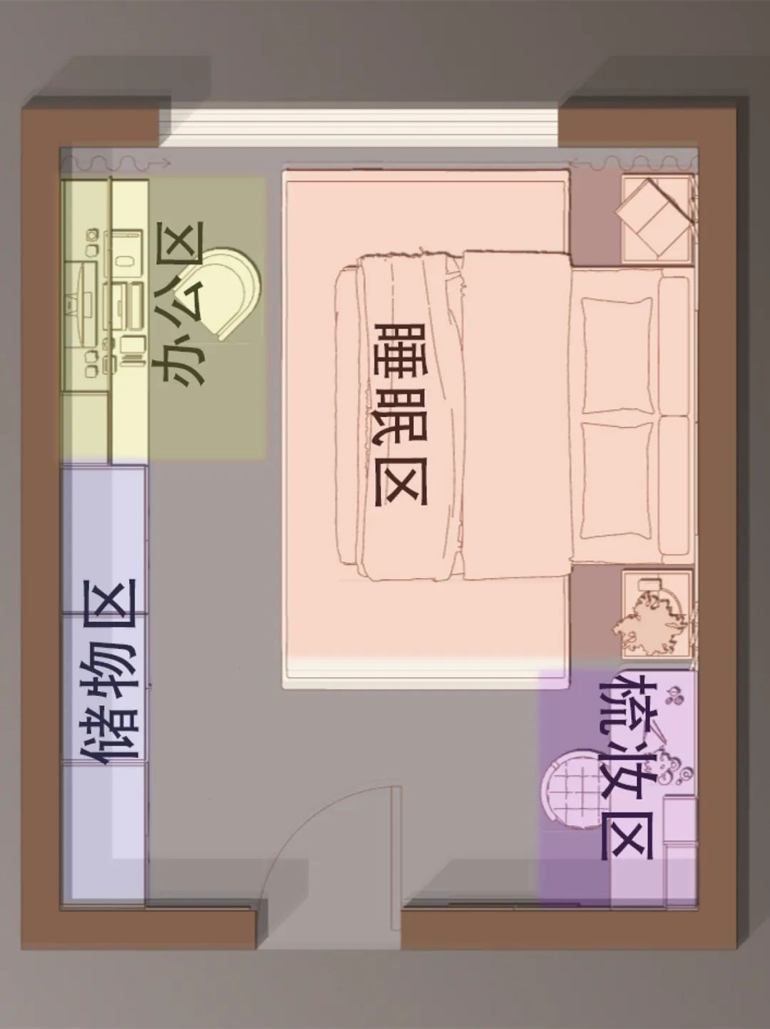 ▫️在规划上处于室内“黄金地段”房间的正中央,其余功效地区环绕就寝区睁开。