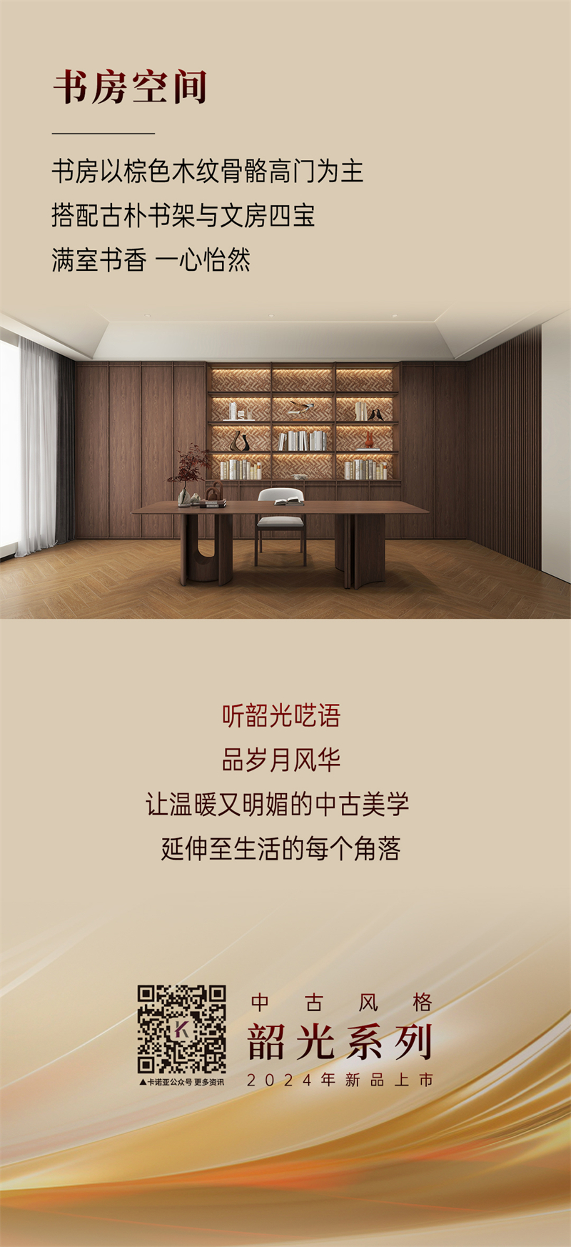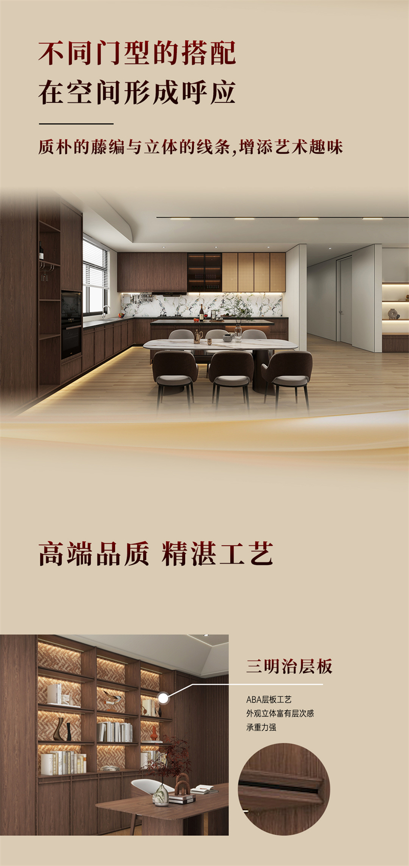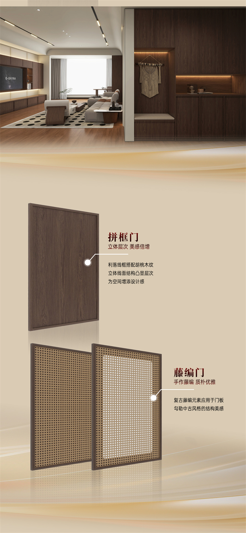 2024年新品系列,时光 |中古风棕色胡桃木纹为主色彩,搭配红色暗纹,细致的藤编门与结实的骨骼门让人遐想到陈旧的家具,布满了光阴的陈迹。木纹的(de)(de)边(bian)框+精密的(de)(de)藤编(bian),自带复(fu)旧(jiu)昏黄美感;拼枢门和藤门连系应用,使全部空间透气感强,并具有(ജyou)怪异(yi)温馨的(de)(de)慵懒空气。