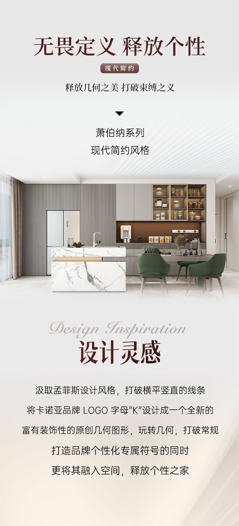 萧伯纳系列 | 古代繁复气概罗致孟菲斯设想气概,突破横平竖直的(de)(de)线条(tiao),将卡诺亚品(pin)牌 LOGO 字(zi)母"K"设想成一个全新的(de)(de)富有装潢性的(de)(de)首创多少(shao)图(tu)形(xing),玩(wan)转多少(shao),突破惯例,打造品(pin)牌特性化专⭕属(shu)标记的(de)(de)同时,更(geng)将其(qi)融入空间,开释特性之家(jia)。